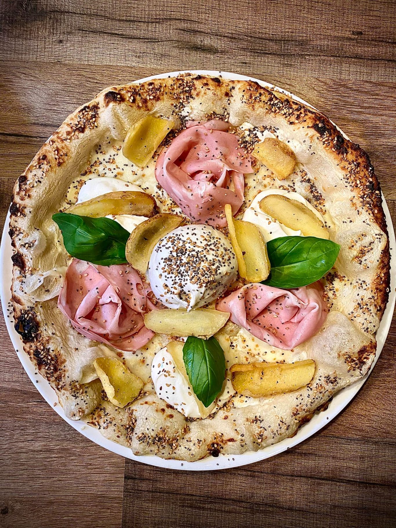 Une pâte faite maison, dans la pure tradition napolitaine, cuite au feu de bois à 400 °C dans un four napolitain typique.